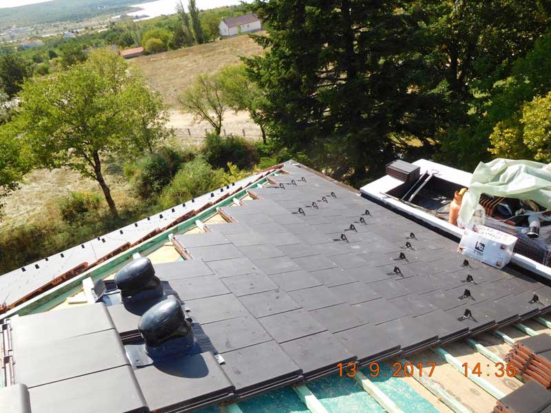 Postavlja se borova daska između rožnika, na dasku se stavlja katranska ljepenka, a po njoj dolazi staklena vuna. Po rožnicima se ponovno zakiva daska na koju ide vodonepropusna a paropropusna folija, iznad idu kontraletve i letve.